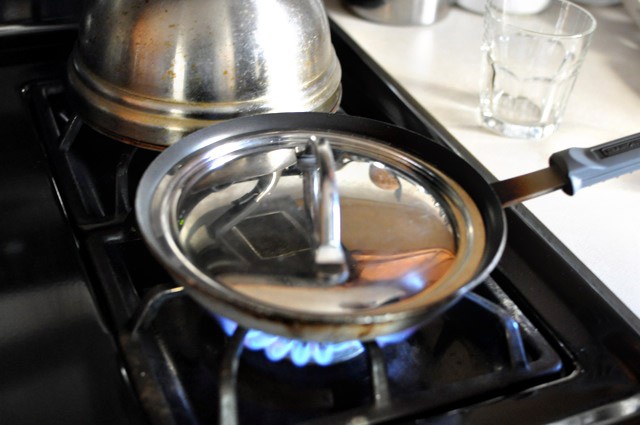 Giờ thì bạn nhớ đậy vung chảo vào và đợi khoảng 45 giây là xong. Phần hơi nóng bốc lên sẽ được giữ lại và làm chín mặt trên của trứng, giúp trứng chín đều và không bị nát khi lật nữa.