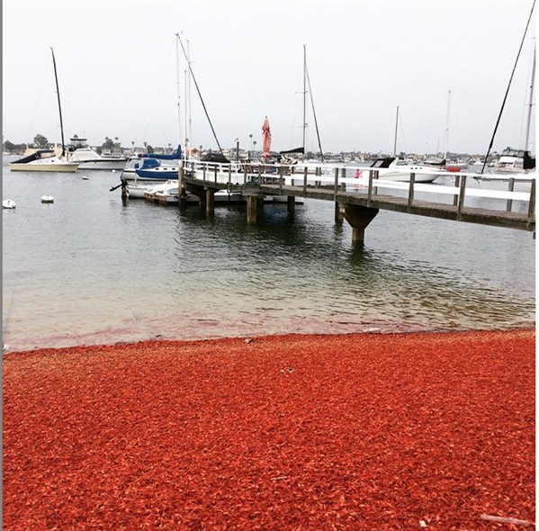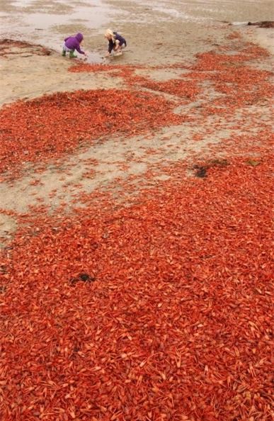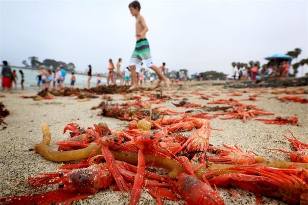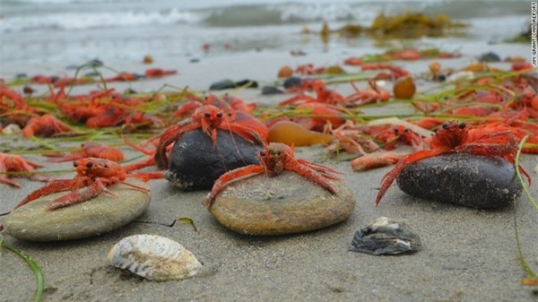 Mới đây, người dân California (Mỹ) đã rất ngạc nhiên khi phát hiện cả một vùng bãi biển rộng lớn bị "nhuộm đỏ" bởi hàng chục ngàn cá thể có hình dáng giống... tôm hùm. Tuy nhiên, trên thực tế, đó là loài cua đỏ bị trôi dạt từ San Diego tới bãi biển Newport.