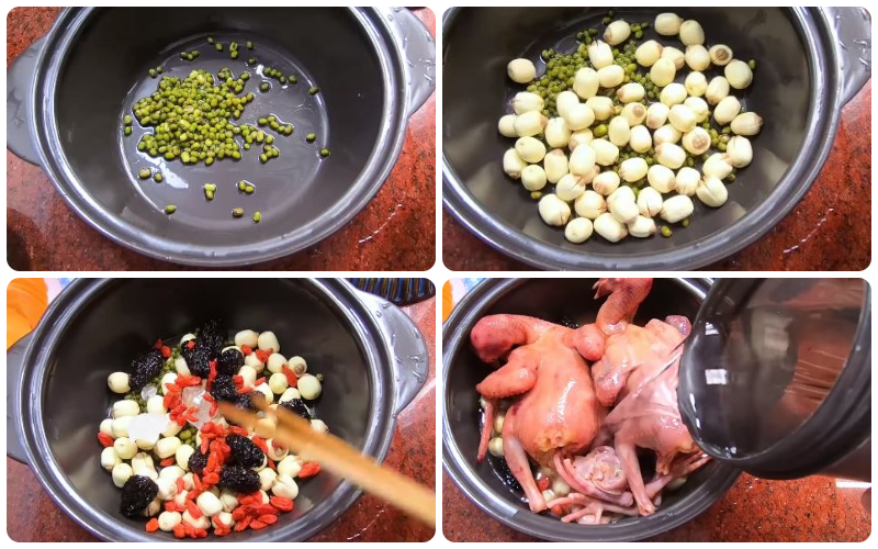 - Tiếp đó, bạn chuẩn bị một cái nồi đất hay nồi inox đều được, cho vào trong đó 20g đậu xanh, 100g hạt sen, 50g táo tàu, 15g đường phèn, 1 thìa cà phê muối, 10g kỳ tử, cà rốt và cuối cùng là hai con chim bồ câu, cho vào 500ml nước lọc, cho lên bếp hầm với lửa nhỏ trong 45 phút là có thể tắt bếp.