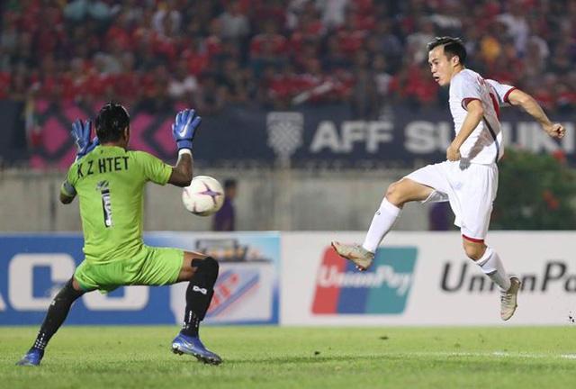 Pha bóng cầu thủ Văn Toàn đưa bóng vào lưới đội Myanmar nhưng bị trọng tài báo lỗi việt vị. Ảnh: TL