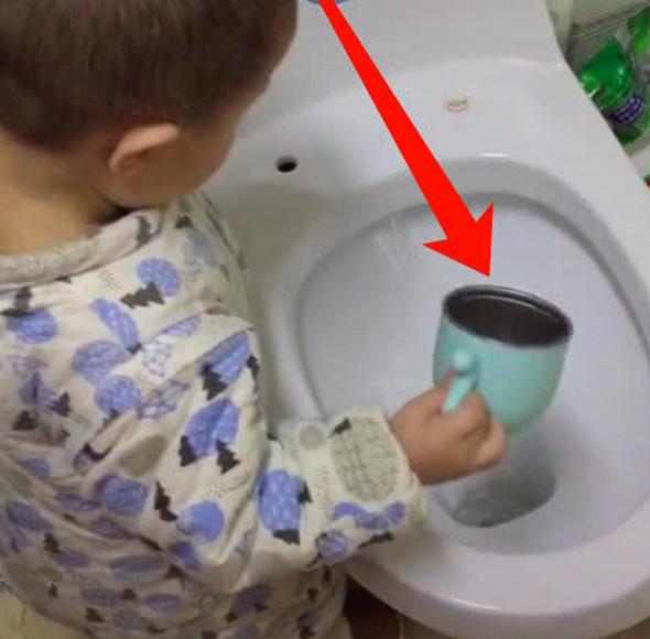 Cậu con trai nhỏ cầm cốc múc nước trong bồn cầu.