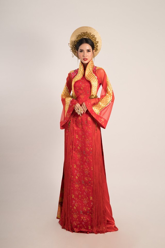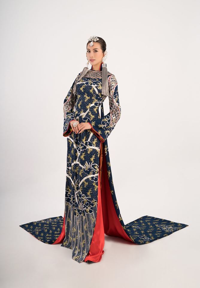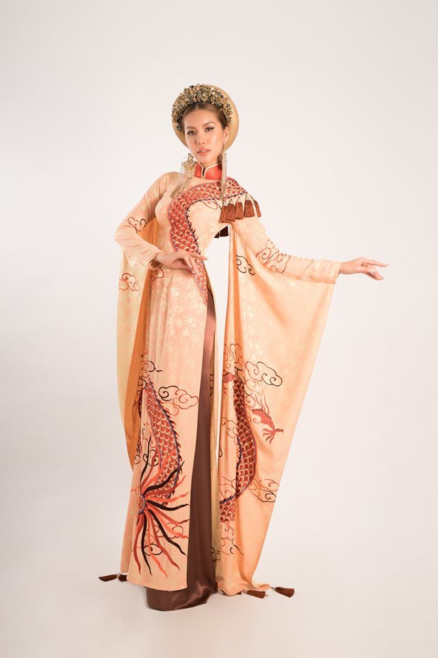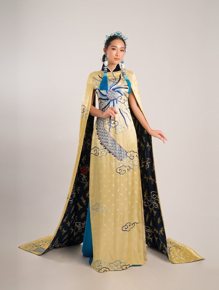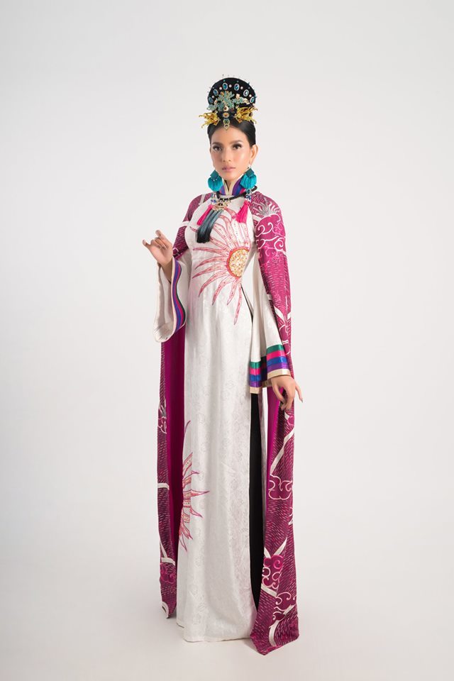 Các người đẹp xuất hiện trong bộ lịch đều mặc trang phục áo dài truyền thống nằm trong BST 'Mây bay Phương Nam' của NTK Võ Việt Chung nhân kỷ niệm 25 làm nghề. Trong ảnh là hoa hậu quốc tế Quỳnh Thy.