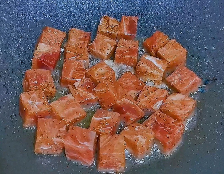 Thịt bò sơ chế sạch sau đó thái thành khối vừa ăn. Ướp thịt bò với bột tiêu và chút dầu oliu trong 10 phút.