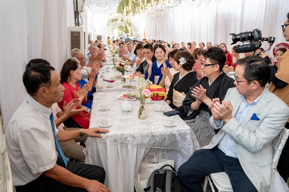 Tại buổi lễ vu quy diễn ra vào ngày 10/8, cả gia đình chú rể Shu Taro đã mặc trang phục kimono truyền thống của người Nhật, trong khi phía đàng gái đều mặc trang phục truyền thống của người Việt.