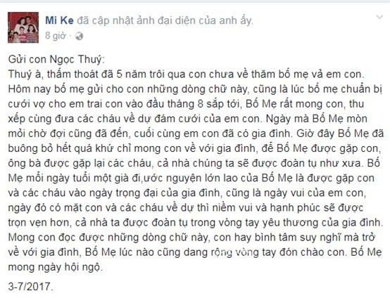 Mới đây, bố mẹ của siêu mẫu Ngọc Thúy đăng ảnh gia đình và lên tiếng chia sẻ trên facebook: "Gửi con Ngọc Thuý. Thuý à, thấm thoát đã 5 năm trôi qua con chưa về thăm bố mẹ và em con. Hôm nay, bố mẹ gửi cho con những dòng chữ này, cũng là lúc bố mẹ chuẩn bị cưới vợ cho em trai con vào đầu tháng 8 sắp tới. Bố mẹ rất mong con, thu xếp cùng đưa các cháu về dự đám cưới của em con. Ngày mà bố mẹ mòn mỏi chờ đợi cũng đã đến, cuối cùng em con đã có gia đình. Giờ đây bố mẹ đã buông bỏ hết quá khứ chỉ mong con về với gia đình, để bố mẹ được gặp con, ông bà được gặp lại các cháu, cả nhà chúng ta sẽ được đoàn tụ như xưa. Bố mẹ mỗi ngày tuổi một già đi, ước nguyện lớn lao của bố mẹ là được gặp con và các cháu vào ngày trọng đại của gia đình, cũng là ngày vui của em con. Ngày đó có mặt con và các cháu về dự thì niềm vui và hạnh phúc sẽ đựợc trọn vẹn hơn, cả nhà ta được đoàn tụ trong vòng tay yêu thương của gia đình. Mong con đọc được những dòng chữ này, con hay bình tâm suy nghĩ mà trở về với gia đình, bố mẹ lúc nào cũng dang rộng vòng tay đón chào con. Bố mẹ mong ngày hội ngộ".