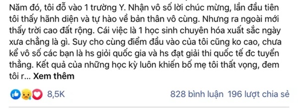 “Năm đó, tôi đỗ vào 1 trường Y, nhận vô số lời chúc mừng, lần đầu tiên tôi thấy hãnh diện và tự hào về bản thân vô cùng. Nhưng ra ngoài mới thấy trời cao đất rộng. Cái việc là 1 học sinh chuyên hóa xuất sắc ngày xưa chẳng là gì.