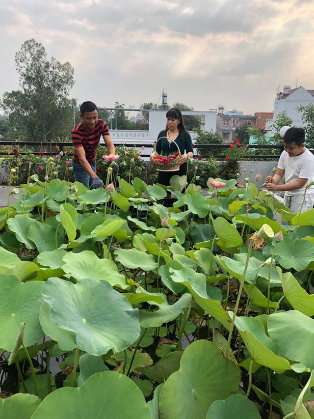 Không gian sân thượng xanh ngắt từ các ruộng rau và bồn sen của gia đình anh Huynh, chị Gấm.
