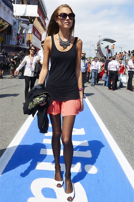 | Cuối tuần qua, người đẹp Nga dành thời gian cổ vũ tay đua Alonso tại chặng đua Catalunya trên quê hương của chàng. Dasha Kapustina gây chú ý bởi vóc dáng mảnh mai 'siêu mỏng' của mình. |