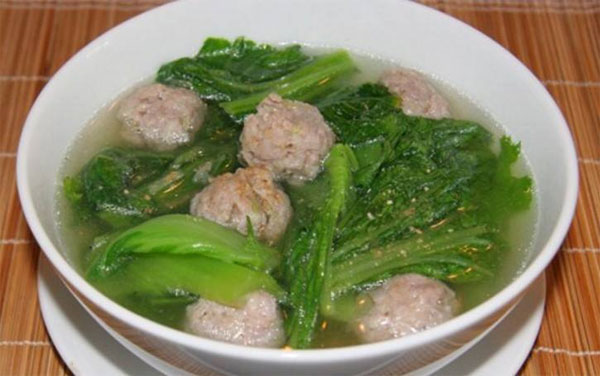 Cách làm: Thịt nạc dăm bằm nhuyễn với hành, ớt trái, hạt nêm, đường, muối rồi vo viên. Cải bẹ xanh ngâm với nước muối, rửa sạch rồi thái khúc vừa ăn.
