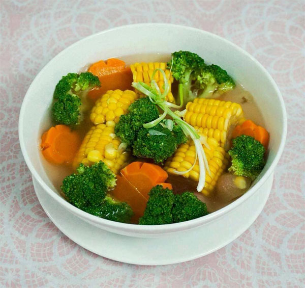 Nguyên liệu:300g sườn non, 2 trái bắp mỹ non, 1 củ cà rốt, 1 quả su su, 50g nấm đinh. Dầu ăn. Ngò rí. Hạt nêm. Tiêu