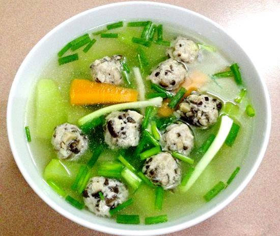 Múc canh cải bẹ xanh và thịt heo viên ra bát, rắc vào ít tiêu rồi dùng nóng.
