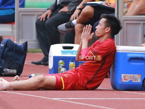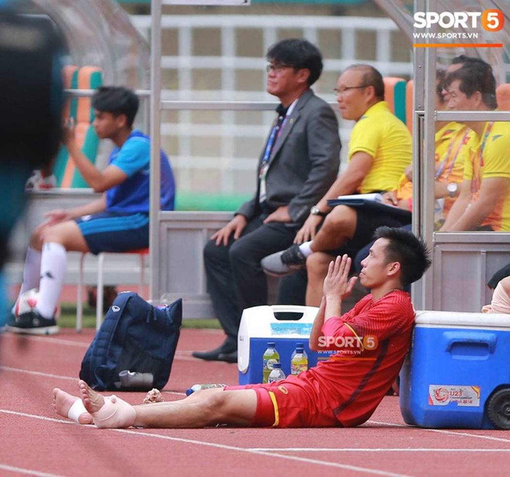 Phải rời sân sớm vì một chấn thương khá nặng trong trận quyết chiến UAE, Văn Quyết đã không thể cùng các đồng đội chiến đấu đến hết trận. Ngồi bên ngoài đường pitch, anh chắp tay cầu nguyện những điều may mắn sẽ đến với Olympic Việt Nam.