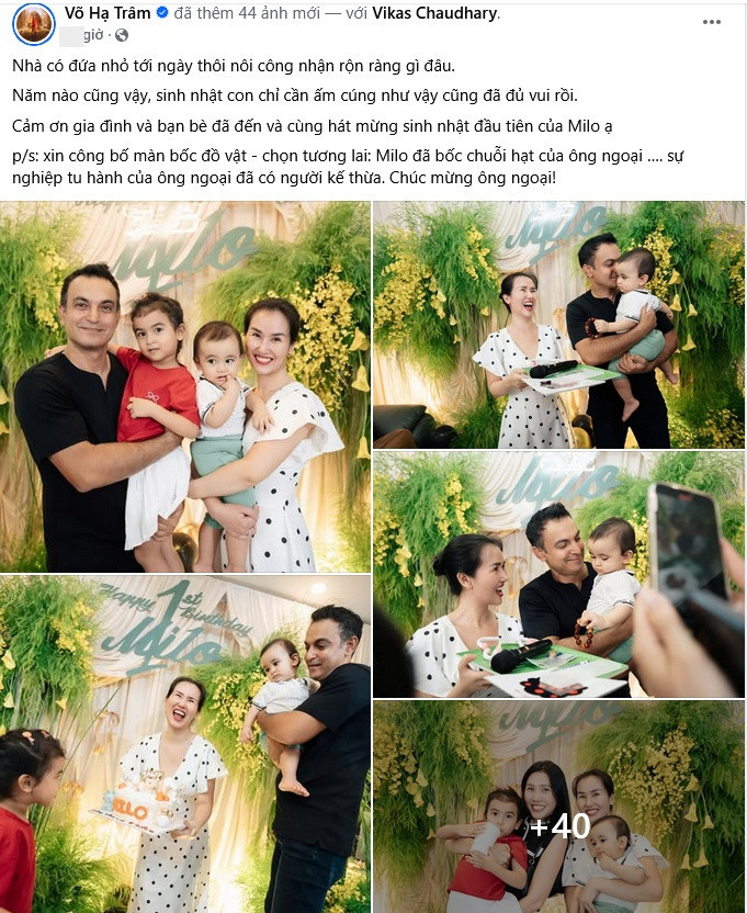 Nữ ca sĩ đăng hình kèm dòng trạng thái: "Nhà có đứa nhỏ tới ngày thôi nôi công nhận rộn ràng gì đâu. Năm nào cũng vậy, sinh nhật con chỉ cần ấm cúng như vậy cũng đã đủ vui rồi. Cảm ơn gia đình và bạn bè đã đến và cùng hát mừng sinh nhật đầu tiên của Milo ạ