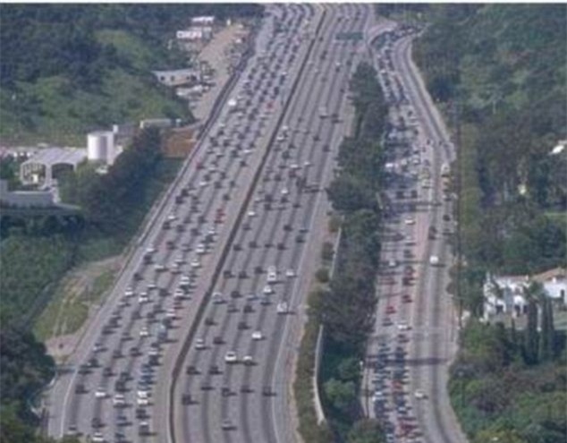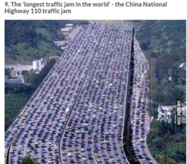 Bức ảnh trên được giới thiệu là chụp ở tuyến đường cao tốc 110 ở Trung Quốc. Vậy nhưng, bức ảnh gốc thực ra được chụp ở tuyến đường I-405, miền Bắc Los Angeles, California, Mỹ và như bạn có thể thấy, dòng xe trên đường khi đó thì không phải là quá đông.