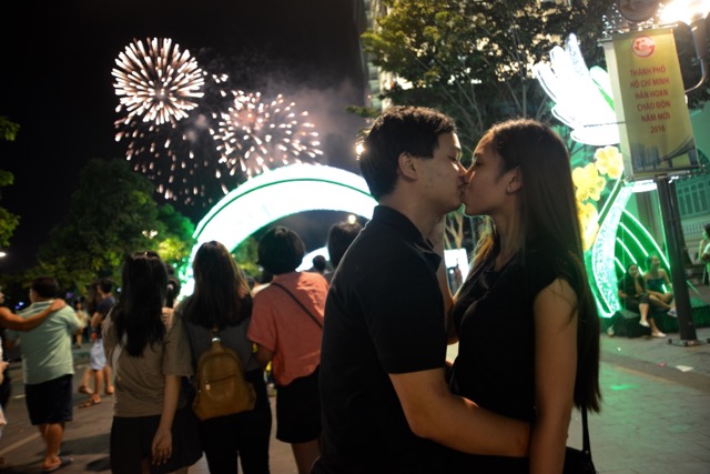 Các cặp đôi tranh thủ ghi lại những phút giây lãng mạn và hạnh phúc trong thời khắc chuyển giao năm mới. Họ trao nhau những nụ hôn nồng nàn, vòng tay ôm chặt... đầy ý nghĩa.