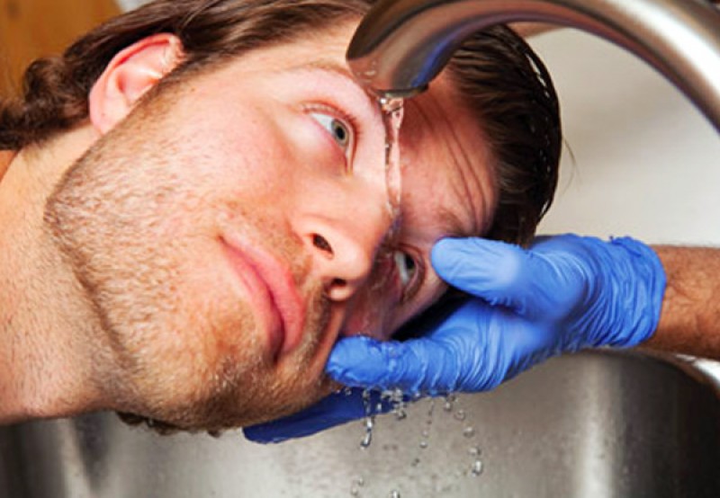 - Bình tĩnh, tránh trường hợp thấy đau rát thì đưa tay lên dụi mắt. Hành động này có thể khiến axit loang ra, làm tổn thương giác mạc.
