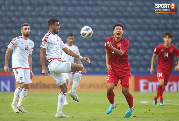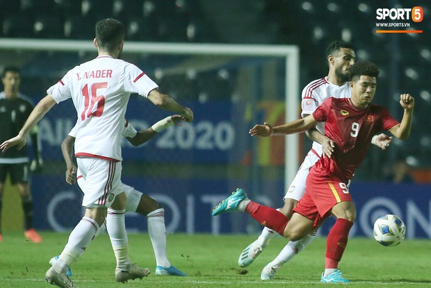 Sau tình huống bị phạm lỗi, Đức Chinh vẫn bị cầu thủ UAE theo kèm rất sát. Có đến 3 cái bóng áo trắng theo kèm tiền đạo số 9 U23 Việt Nam.