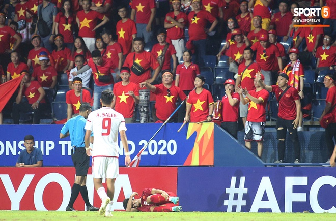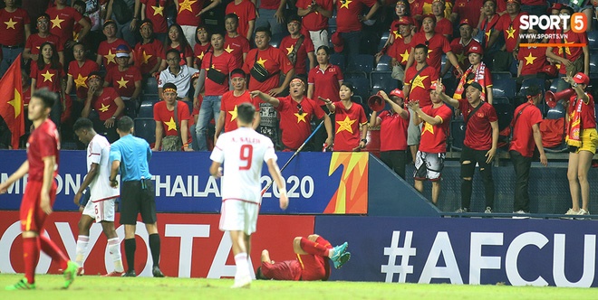 Khá đông fan của U23 Việt Nam trên khán đài phản ứng kịch liệt trước pha vào bóng khá thô bạo của cầu thủ UAE.