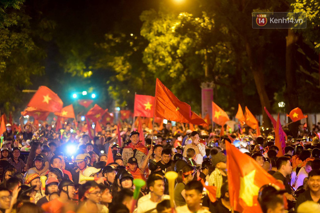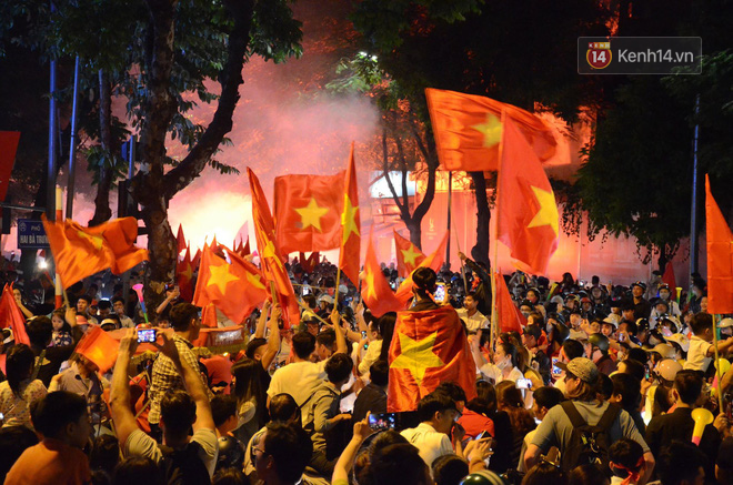 Như thường lệ, phố đi bộ Hồ Gươm là nơi người hâm mộ ùn ùn kéo để để ăn mừng sau mỗi trận đấu bóng của đội tuyển Việt Nam. Hôm nay xe cộ không di chuyển được vào bên trong tuyến phố, thế nhưng ngay bây giờ không khí tại đây vô cùng cuồng nhiệt.