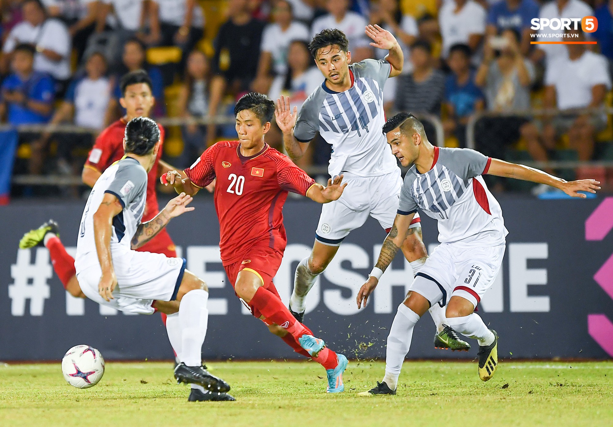 Phan Văn Đức, cầu thủ xuất sắc nhất trận có pha "khiêu vũ" giữa rừng cầu thủ Philippines.