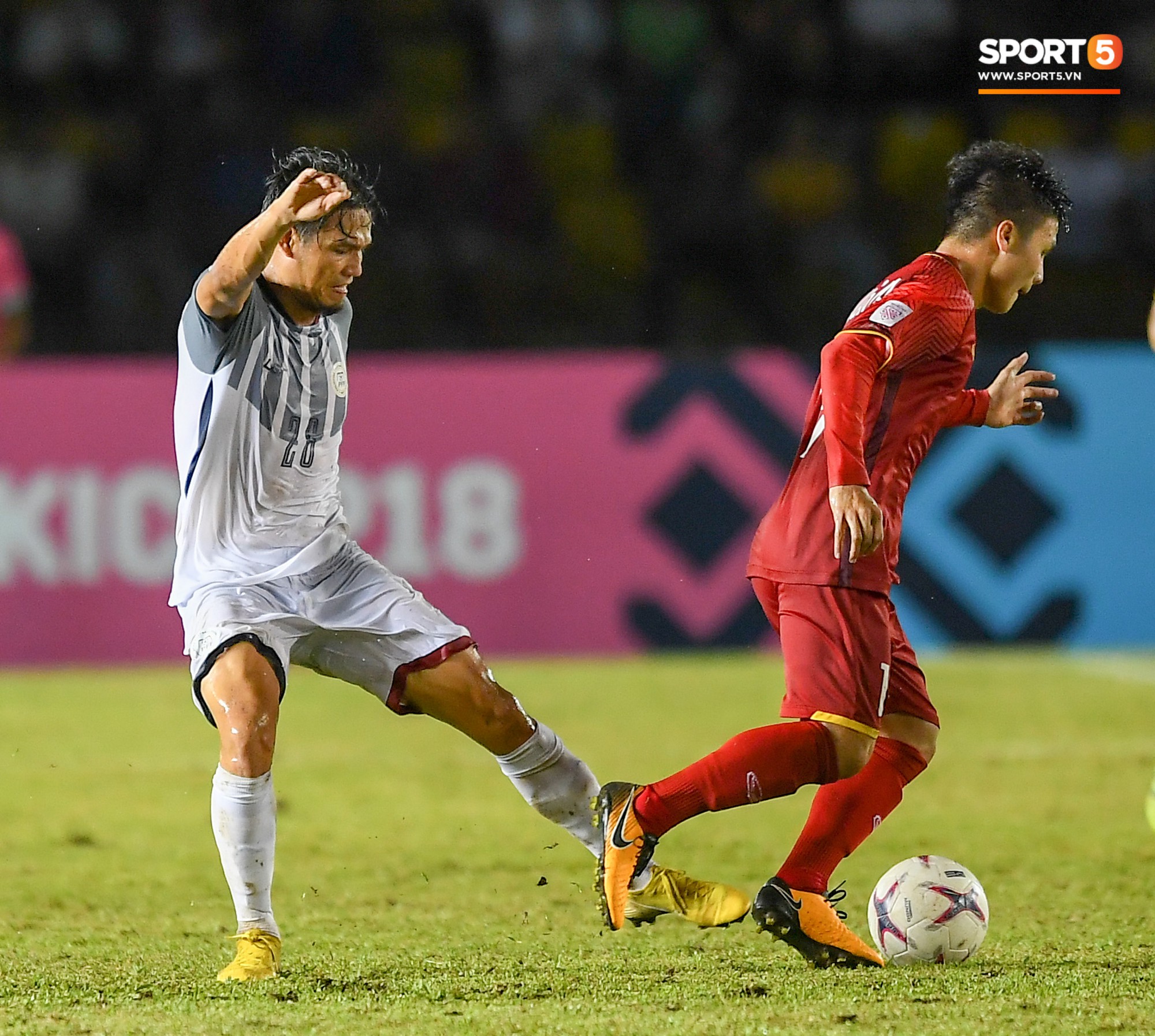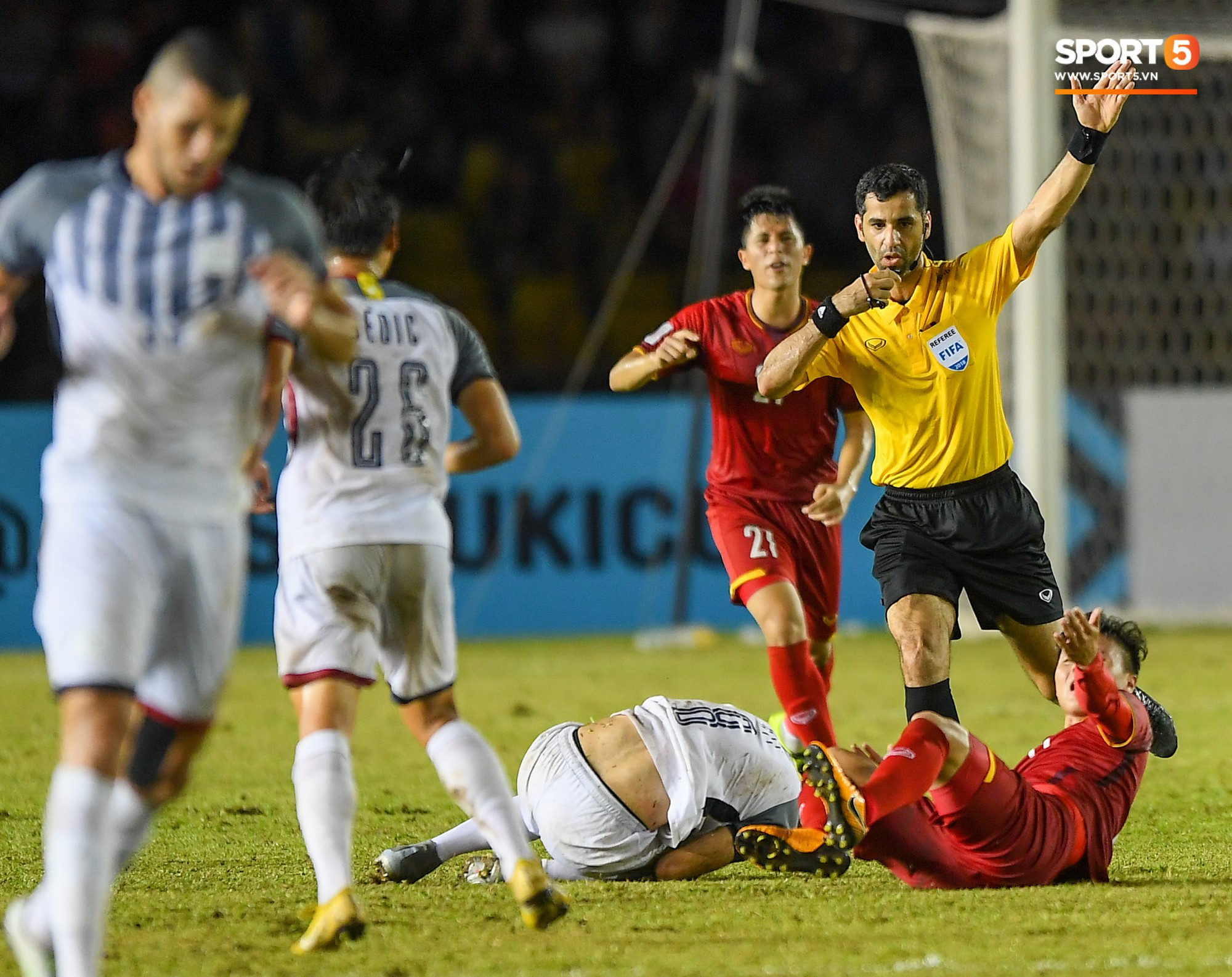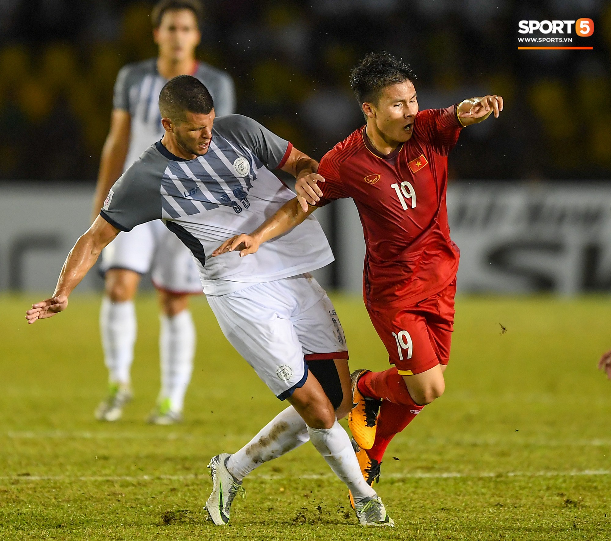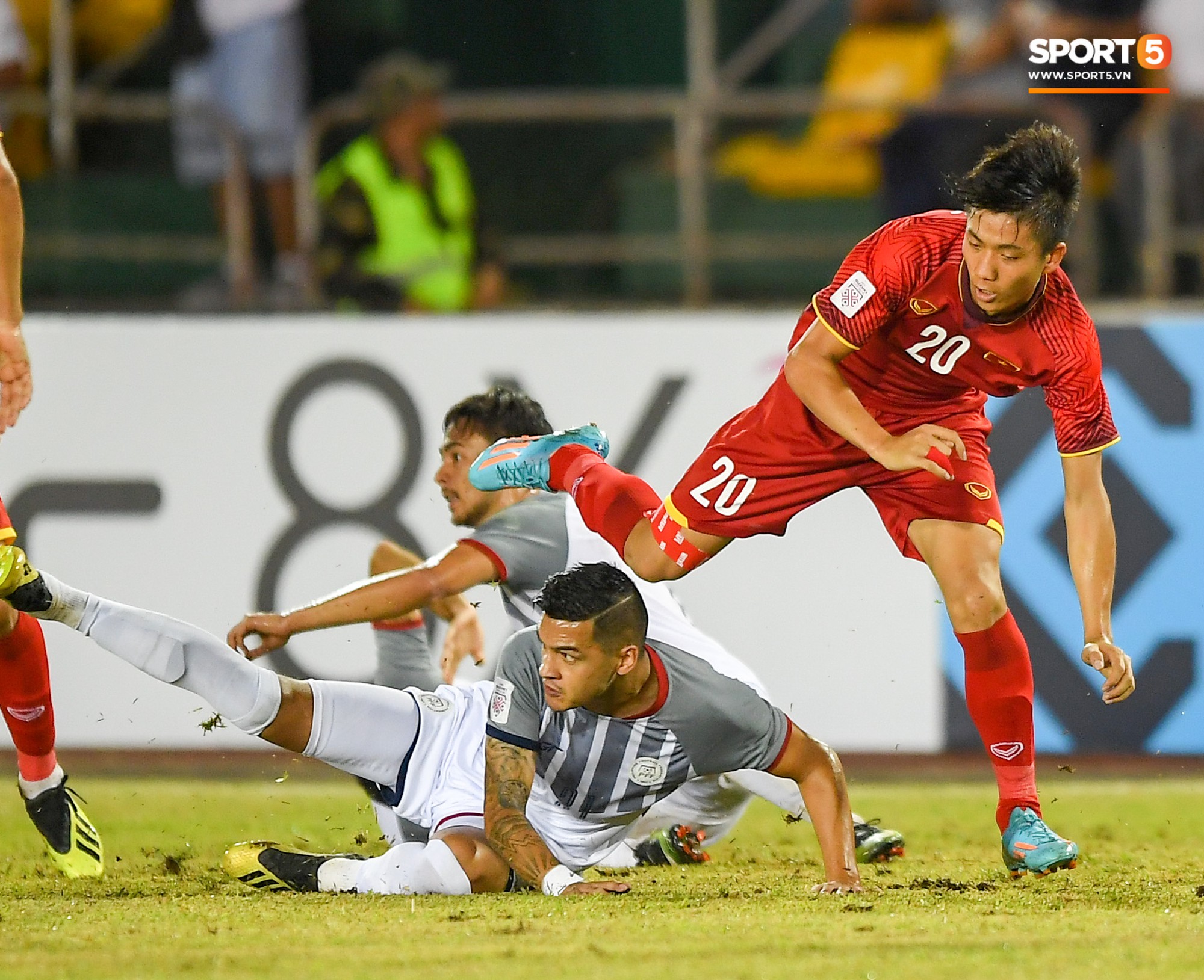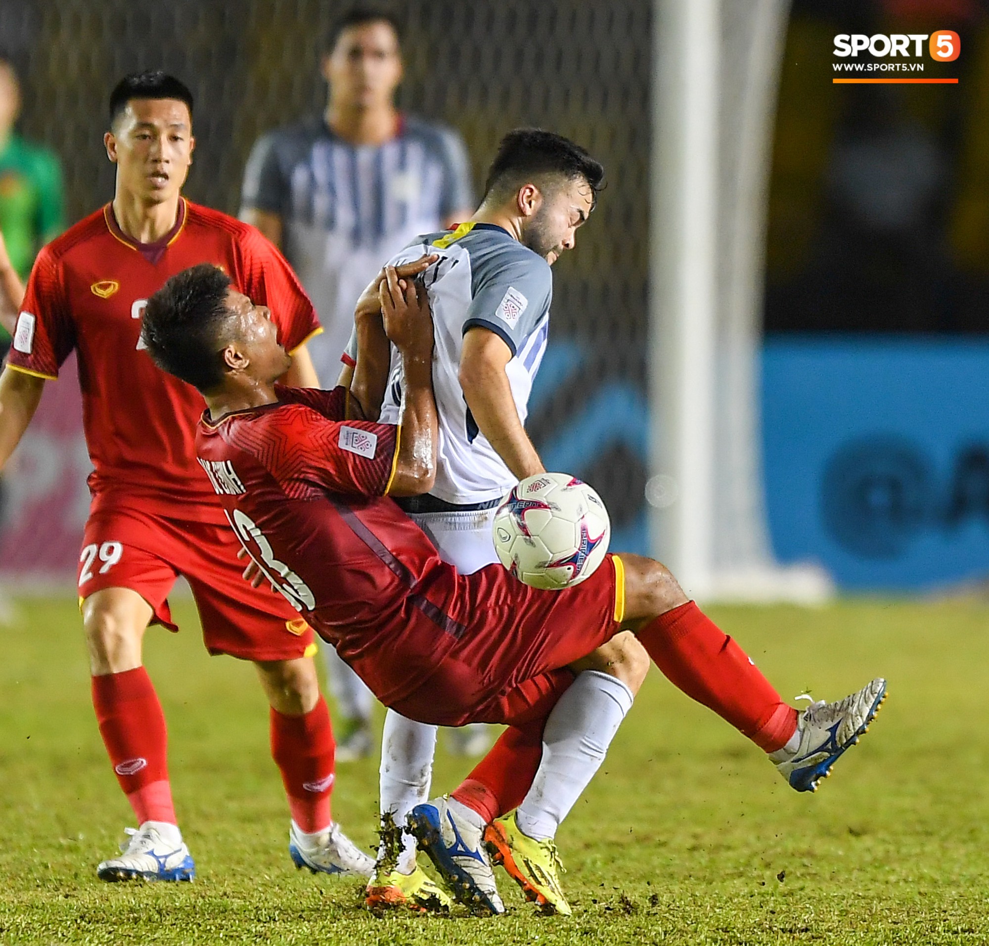 Tiếp tục bị một cầu thủ Philippines ngáng chân dù đã qua người.