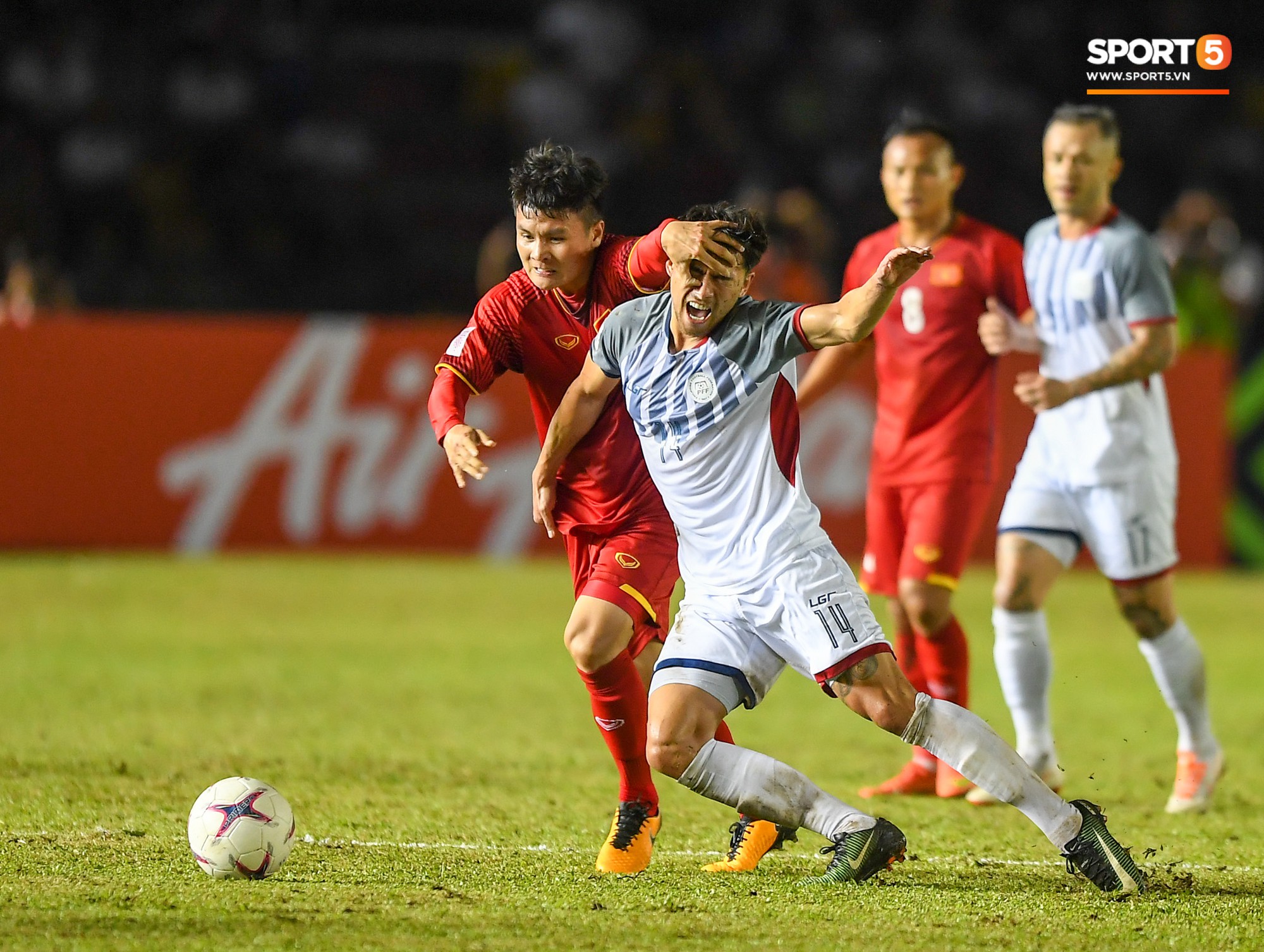 Sau đó, Hải "con" trở thành mục tiêu chặt chém của các cầu thủ Philippines. Alvaro Silva, đồng đội cũ của Quang Hải tại Hà Nội FC cũng không hề nương chân.