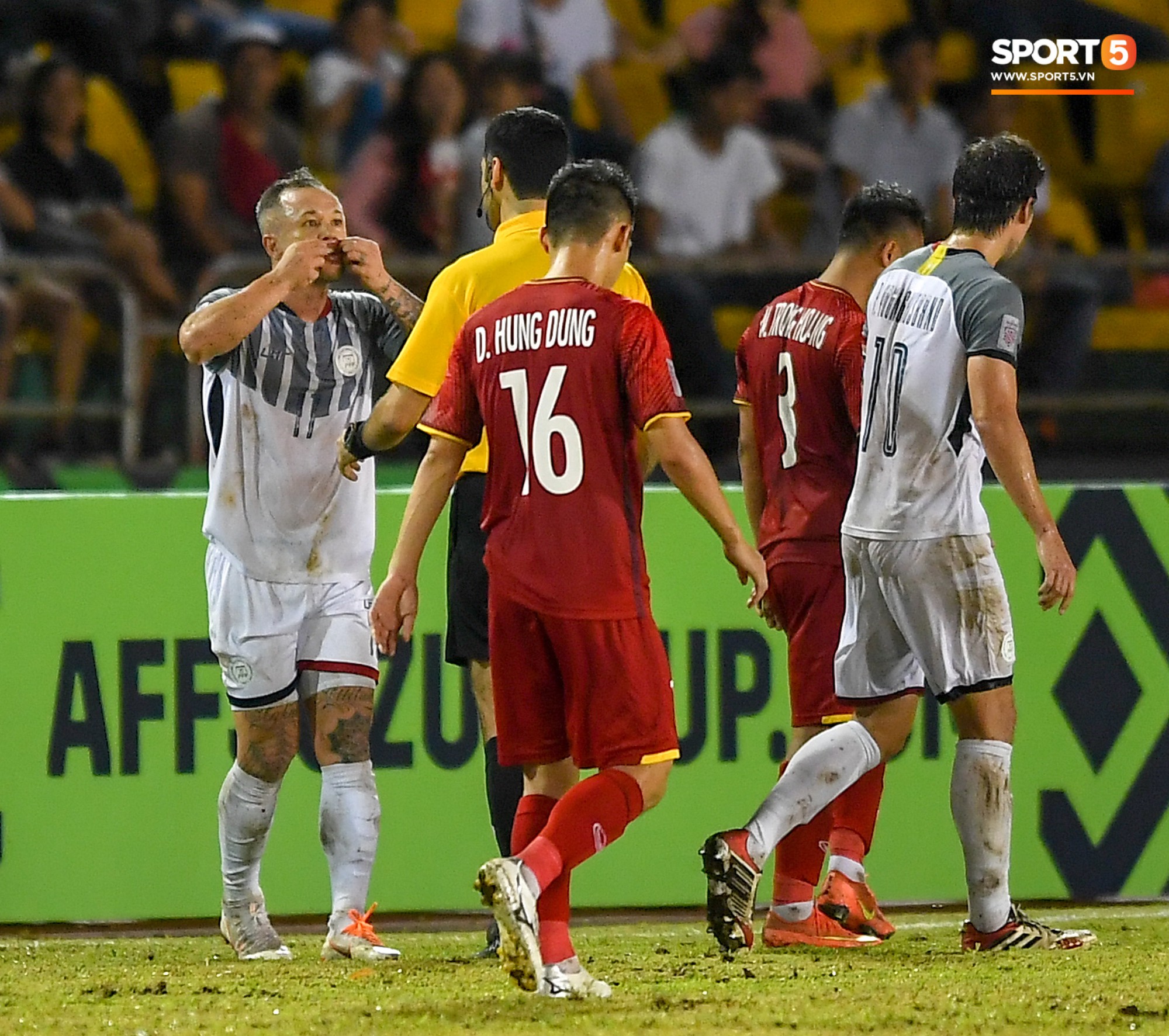 Bên phía Philippines cũng không vừa, tiền vệ Stephan Schrock chỉ hẳn vào vùng môi ám chỉ anh vừa bị các tuyển thủ Việt Nam phạm lỗi.