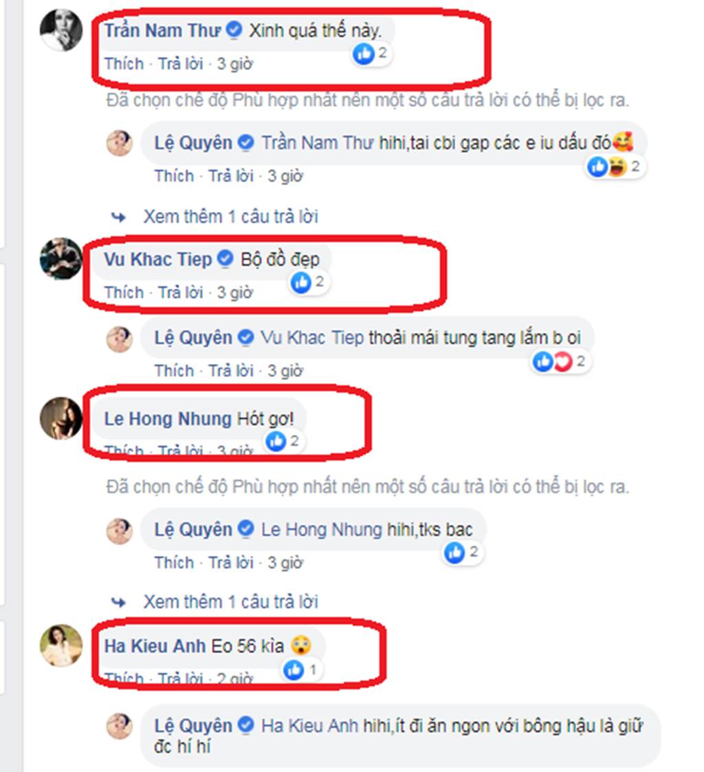 Loạt ảnh của Lệ Quyên ngay sau đó nhận được "bão" lời khen: "Xinh quá thế này"; "Bộ đồ đẹp"; "Hot girl"; "Eo 56cm"...lần lượt từ diễn viên Nam Thư, ông bầu Vũ Khắc Tiệp, ca sĩ Hồng Nhung, Hoa hậu Hà Kiều Anh...