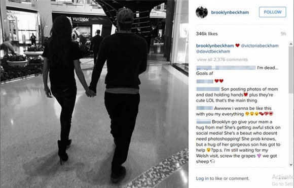 Khoảnh khắc vợ chồng Vic nắm tay nhau mà Brooklyn Beckham chia sẻ thu hút nhiều lượt like. Brooklyn Beckham đã ngầm khẳng định tình cảm của bố mẹ ngày càng gắn kết.