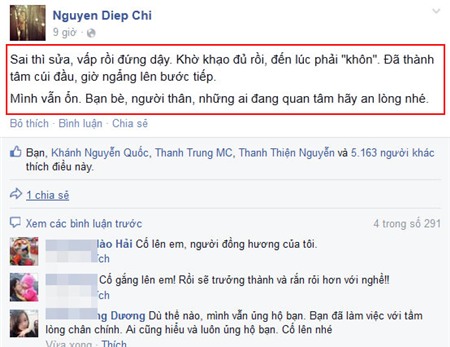 Mới đây nhất trên trang cá nhân của mình Diệp Chi chia sẻ:" Sai thì sửa, vấp rồi đứng dậy. Khờ khạo đủ rồi, đến lúc phải "khôn". Đã thành tâm cúi đầu, giờ ngẩng lên bước tiếp.