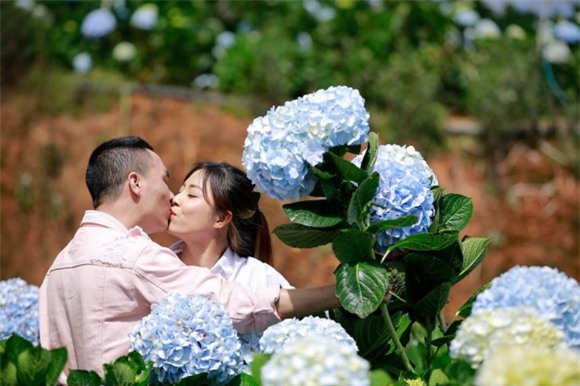 BTV Nguyễn Hoàng Linh ngọt ngào hôn chồng sắp cưới ở vườn hoa cẩm tú cầu.