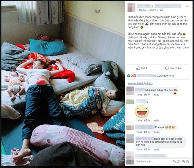 Chia sẻ này khiến nhiều người, đặc biệt là các mẹ bỉm sữa thích thú. Người thì chúc mừng gia đình hạnh phúc của chị M.M., người lại ghen tị với mái ấm bình yên này. Không ít người thì đồng cảm với mẹ trẻ này và vui vẻ chia sẻ hình nền điện thoại của chồng.