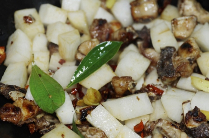 Bước 3: Thêm ớt khô, gừng thái lát và lá nguyệt quế vào đảo chung cho đến khi dậy mùi thơm. Tiếp theo bạn cho sườn và củ cải cắt khối vào đảo đều tay. Đổ một lượng rượu nấu ăn, nước tương thích hợp vào xào cho đến khi các nguyên liệu ngấm đều gia vị.