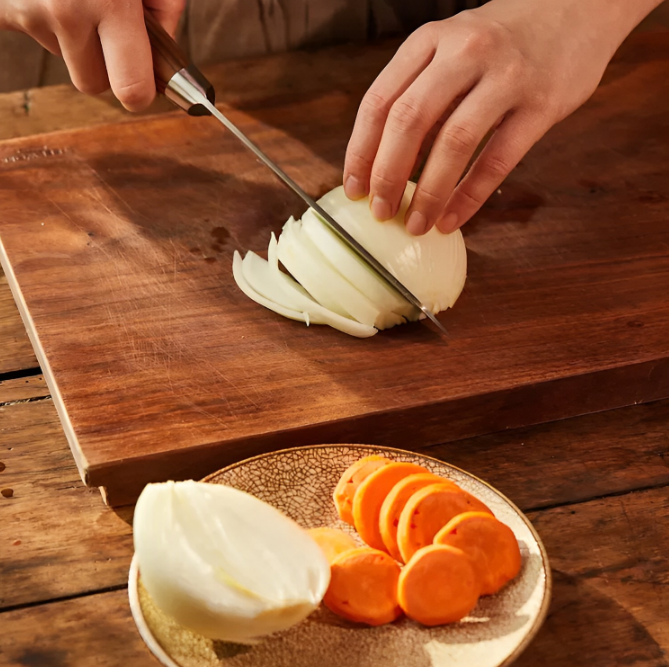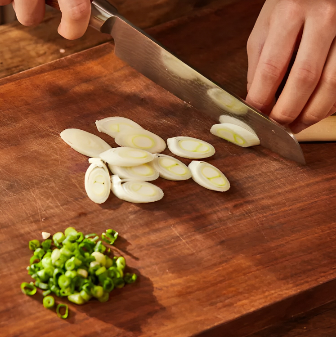 Bước 3: Cà rốt cắt thành lát mỏng và hành tây thì cắt thành các lát dày. Tiếp đến, cắt hành lá theo đường chéo và cắt hẹ thành các khúc nhỏ.