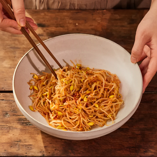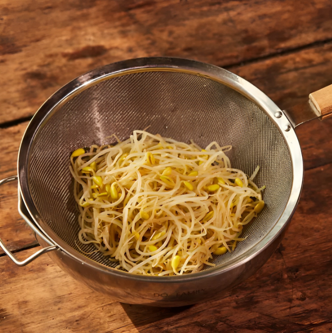 Bước 7: Chuẩn bị thêm một chiếc nồi khác, sau đó cho vào nồi 2 chén nước. Khi nước sôi, nêm vào một chút muối và cho giá đỗ vào, chần giá đỗ khoảng 1 phút. Tiếp đến, chắt nước qua rây rồi trộn với gia vị cho giá đỗ gồm bột ớt, tỏi băm nhỏ, muối, dầu mè, bột tiêu, vừng.