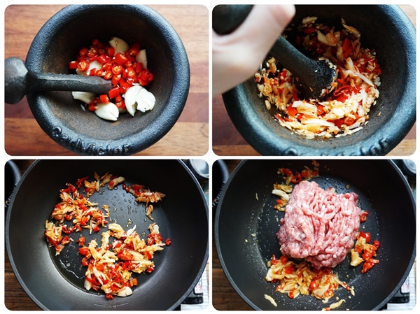 Bước 2: Cho ớt, tỏi vào cối rồi giã nát. Đổ chút dầu ăn vào chảo đun nóng rồi đổ tỏi, ớt đã giã nhuyễn vào xào thơm. Tiếp đó đổ thịt băm vào xào chung.