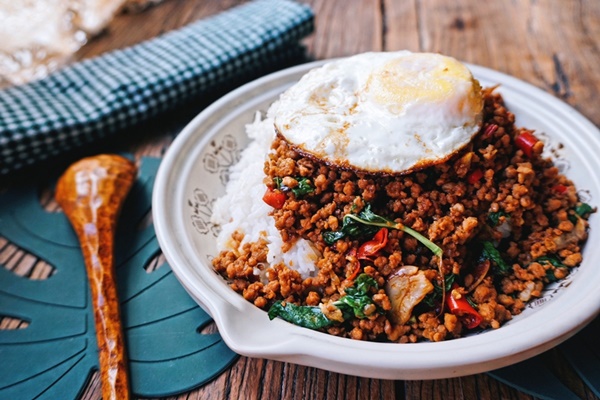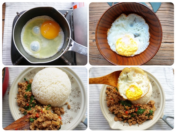 Bước 4: Đun nóng chút dầu ăn trong chảo, đập trứng vào chiên ốp la cho trứng chín. Lấy cơm ra đĩa, thêm thịt băm xào kiểu Thái vào, tiếp đó thêm trứng ốp la vào rồi thưởng thức.