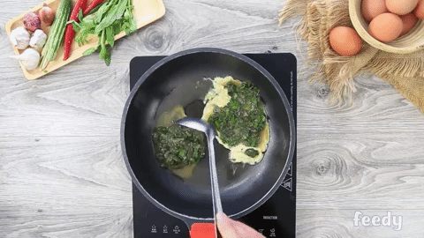 Bạn cũng có thể đổ cả bát trứng - lá mơ vào và chiên trong 1 lần nếu muốn.