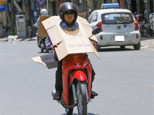 Để tránh nắng nóng, khói bụi người đi đường cũng đã từng dùng rất nhiều cách khác nhau để bảo vệ cơ thể, làn da của mình. Không chỉ là đeo khẩu trang, nhiều người thậm chí còn khoác chăn lên mình, hay dùng bìa các tông để chống nắng.