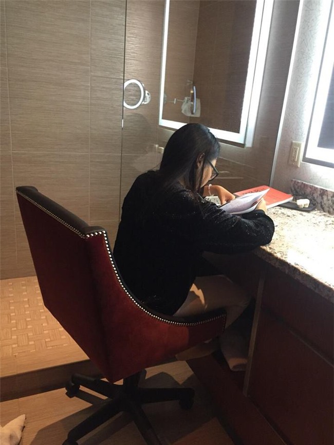 Hình ảnh Phương Mỹ Chi chăm chú ngồi học bài trong toilet khách sạn khi đang chạy show bên Mỹ lan truyền gây xôn xao.