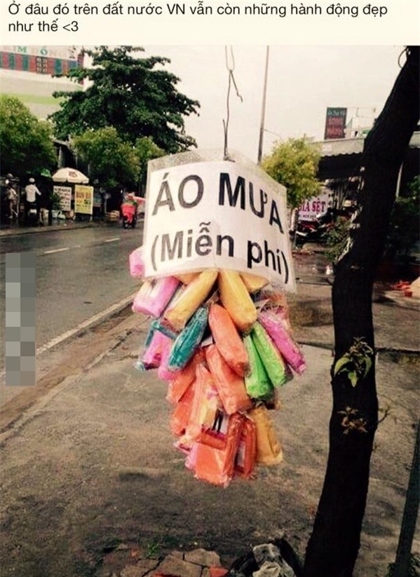Trong bức hình ảnh, một người tốt bụng nào đó đã treo chùm áo mưa lên giá và kèm theo tấm biển "áo mưa miễn phí". Những người lao động nghèo hay những người nhỡ nhàng, gặp tình huống bất khả kháng trên đường đều có thể sử dụng.