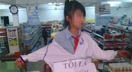 Trong tấm ảnh là hình một cô bé nhỏ nhắn đang bị trói tay vào lan can bằng băng dính trong tình trạng “không thể phản kháng”. Chưa hết, nữ sinh này còn bị treo một tấm bảng được in hoa “Tôi là người ăn trộm”. Theo người chia sẻ thì bức ảnh này được chụp trong một siêu thị, có lẽ người trói cô bé này là một trong số nhân viên của siêu thị khi biết cô gái cố tình lấy trộm đồ.