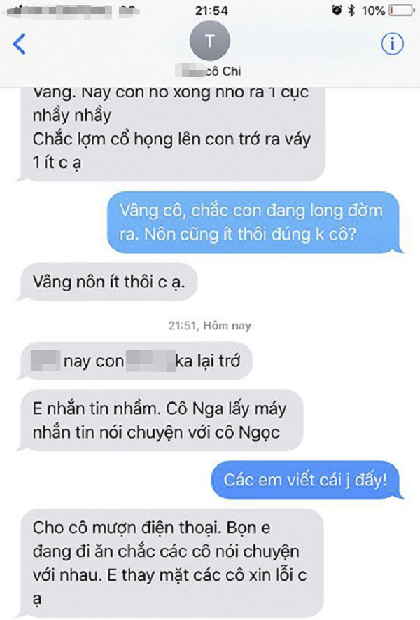 Ngay sau đó, chị Hằng đã liên tục gọi điện cho cô Chi nhiều lần nhưng không liên lạc được và nhận được tin nhắn giải thích rằng nội dung đó do cô Nga - giáo viên khác trong lớp đã lấy máy nhắn tin trao đổi với đồng nghiệp.