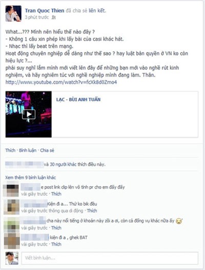 Nguyên văn lời chia sẻ của ca sĩ Quốc Thiên: "What...? Mình nên hiểu thế nào đây? Không một câu xin phép khi lấy bài của ca sĩ khác hát. Nhạc thì lấy beat trên mạng. Hoạt động chuyên nghiệp dễ dàng như thế sao hay luật bản quyền ở Việt Nam không còn hiệu lực? Phải suy nghĩ lắm mình mới viết lên đây để những bạn mới vào nghề rút kinh nghiệm và hãy nghiêm túc với nghề nghiệp mình đang làm. Thân".