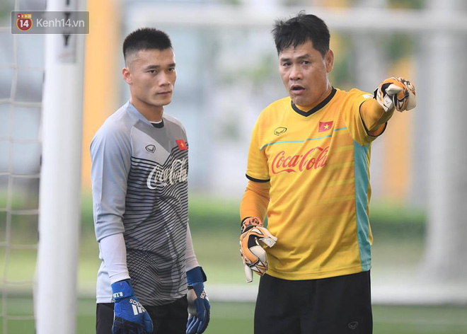 Do mới lên tuyển nên trợ lý thủ môn Nguyễn Đức Cảnh phải dành thời gian để dặn dò những giáo án cho cậu học trò.