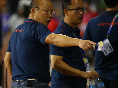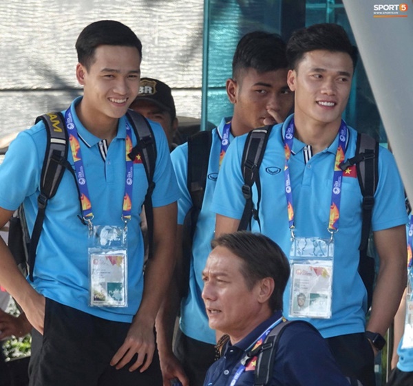 HLV Park Hang-seo cũng đầy tự tin và vui vẻ khi cùng các học trò xuất phát ra sân thi đấu.