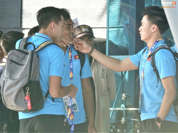 Một lát sau, trợ lý đội tuyển bắt đầu phát thẻ ghi danh cho các cầu thủ để đeo khi vào sân vận động.