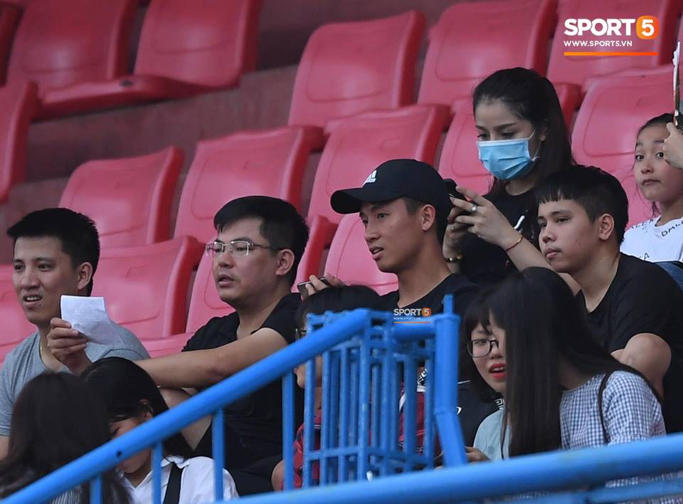 Khánh Linh và Bùi Tiến Dũng ngồi trên khán đài trong trận Viettel gặp Bình Định