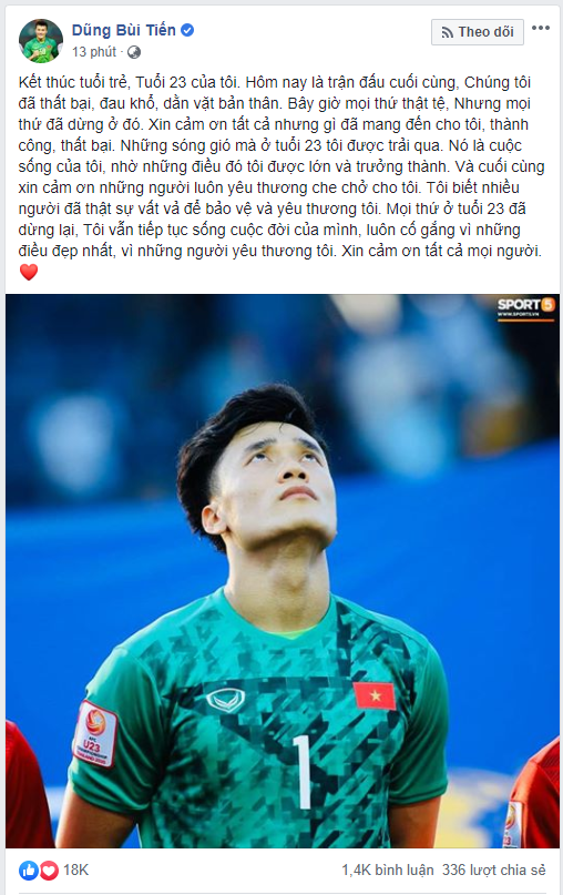 Thủ môn Bùi Tiến Dũng vừa có chia sẻ rất sâu sắc, cảm động sau khi mắc sai lầm rồi phải cùng U23 Việt Nam rời VCK U23 châu Á sớm.
