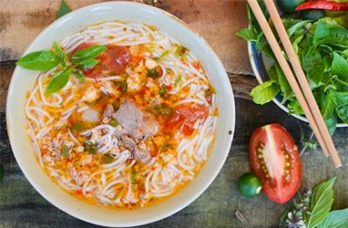 chia sẻ: "Cua, cà chua nấu chín, bún, rau thơm, cùng nhiều nguyên liệu